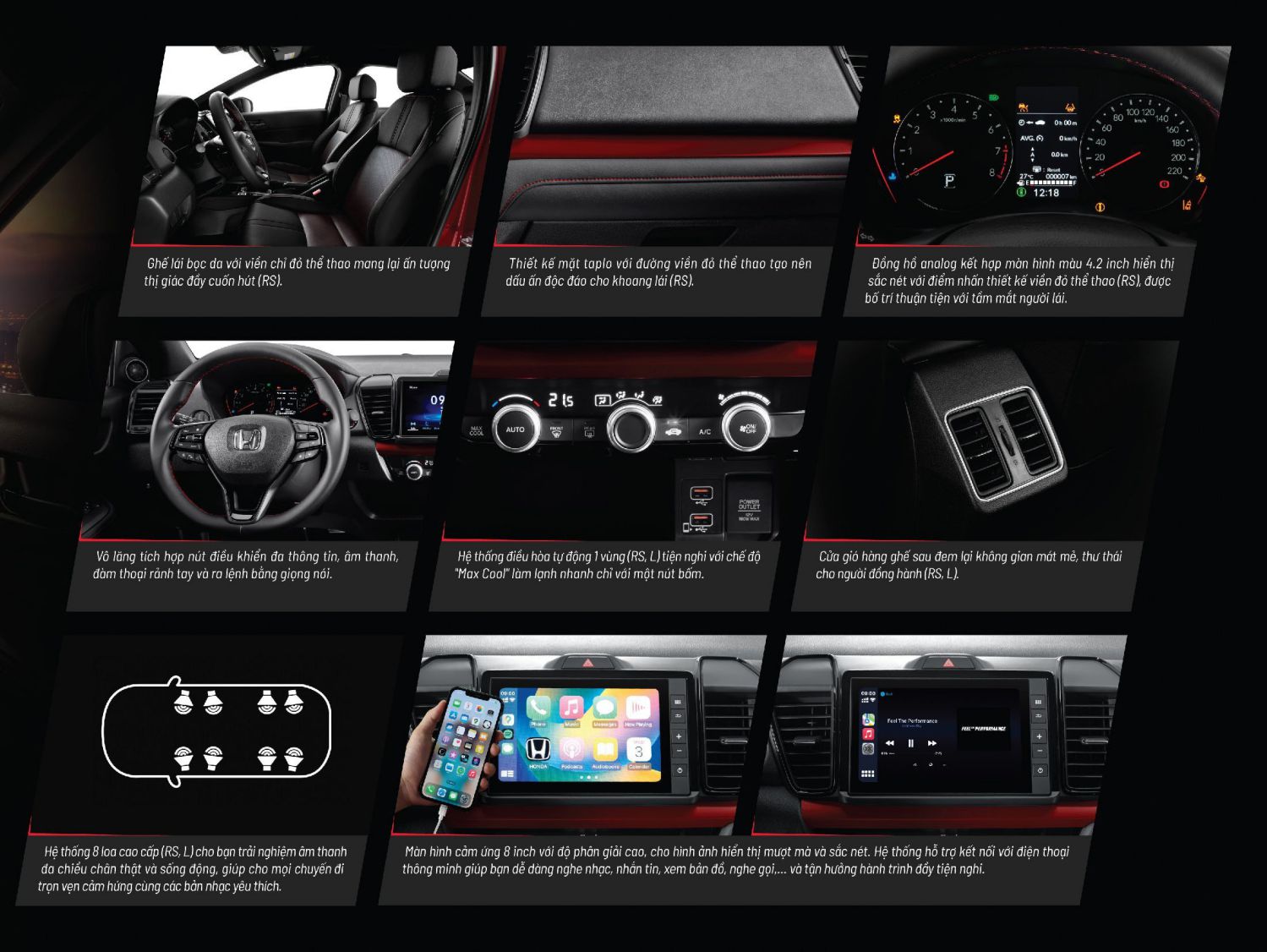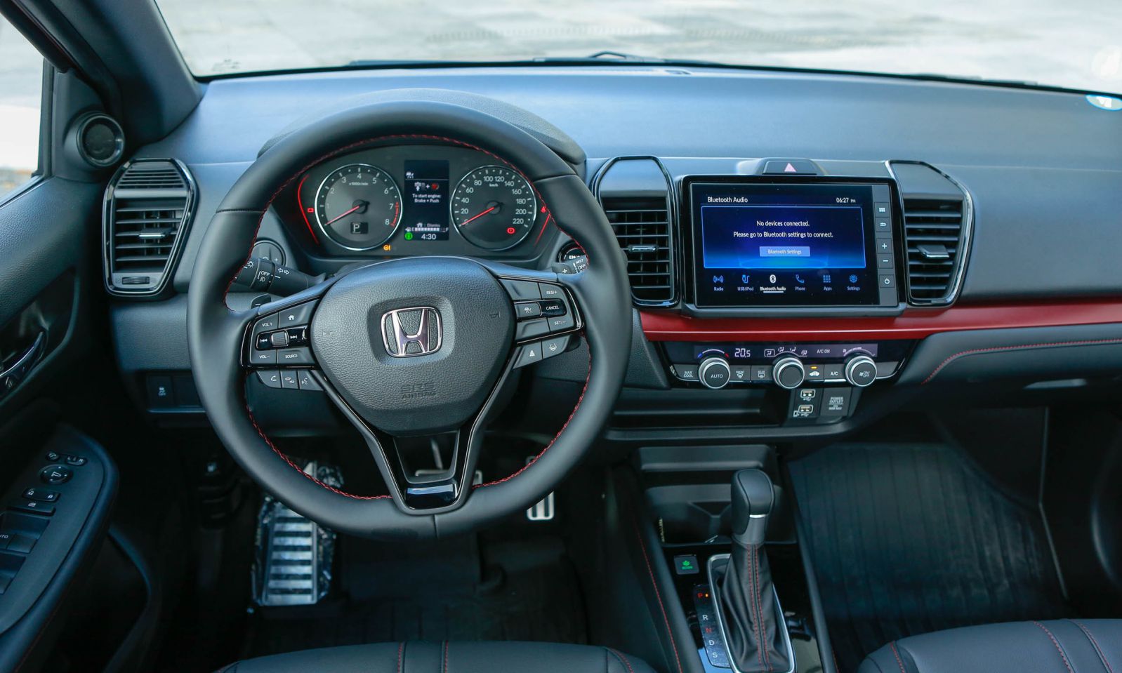 Việc tăng thêm chiều dài và chiều rộng giúp Honda City 2023 có được không gian rộng rãi hơn trước. City tiếp tục là mẫu xe rộng nhất phân khúc hạng B hiện nay. City có hai tuỳ chọn chất liệu bọc ghế. Phiên bản City G và L sử dụng bọc ghế nỉ. Bản cao cấp RS sử dụng bọc ghế da kết hợp da lộn và nỉ, chạy thêm viền chỉ đỏ theo phong cách thể thao đặc trưng của phiên bản này.