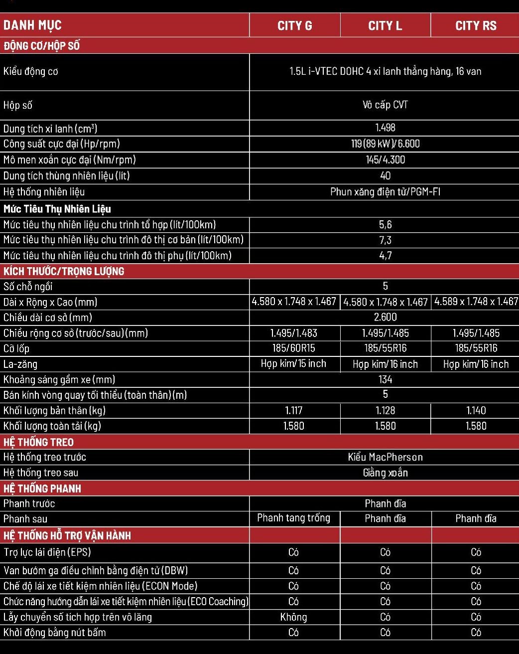 Tuy nhiên khối động cơ I4 1.5L trên City cũng là động cơ mới khi chuyển từ động cơ cam đơn SOHC sang động cơ cam kép DOHC giúp khả năng vận hành tối ưu hơn. Hộp số tự động vô cấp CVT cũng có sự tinh chỉnh. Theo thông số kỹ thuật Honda City 2023 nhà sản xuất cung cấp, động cơ I4 1.5L i-VTEC DOHC cho công suất tối đa 119 mã lực tại 6.600 vòng/phút, mô men xoắn 145Nm tại 4.300 vòng/phút.