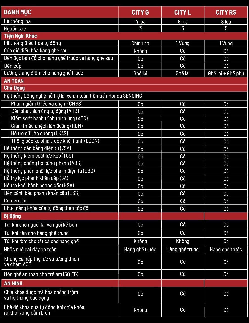Hệ thống an toàn Honda City tương tự các xe hạng B khác như: hệ thống chống bó cứng phanh ABS, hệ thống hỗ trợ lực phanh khẩn cấp BA, hệ thống phân bổ lực phanh điện tử EBD, hỗ trợ khởi hành ngang dốc HSA, hệ thống cân bằng điện tử VSA… Rất tiếc là không có cảm biến lùi.